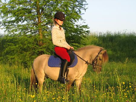 Ik vind Pumba,een waanzinnig leuke pony.Ik keek even in je profiel wat het wel is als het geen shet is.Dus vermoed ik iest welsh-achtigs gezien ze hoofdje.Ik snap ook wel dat dit meisje niet zonder zadel kan rijden ,want dan komen haar voeten echt op de grond.