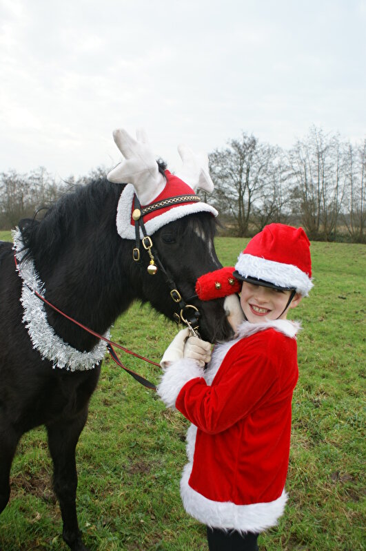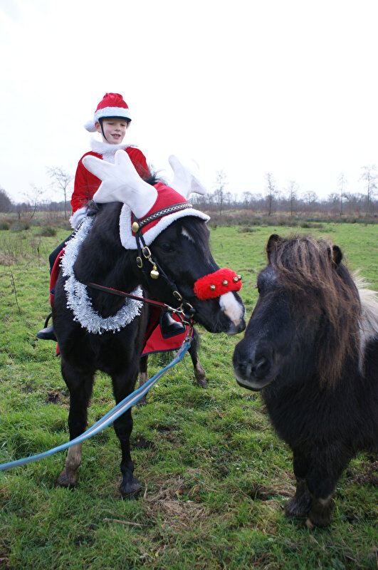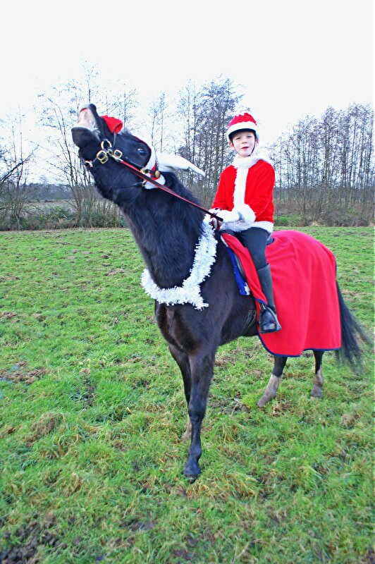 Ik was op het oh zo originele idee gekomen om kindlief en nieuw ponybeest in kerstoutfit te hijsen, hier een leuke foto van te maken, en daar dan weer een kerstkaart van te maken. Die dan zo leuk naar de fokker en de weideverhuurder en de oude baas en allerlei mensen dat zich familie en vrienden noemt kon, en oh wat zouden ze trots zijn nu ze zagen hoe leuk Sven het doet als kinderpony en bladiebla :j