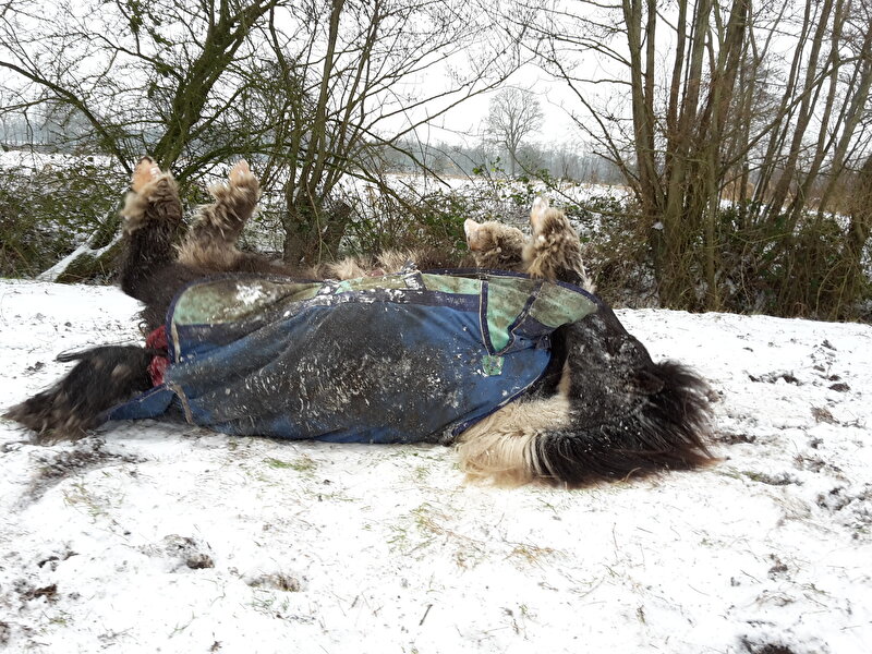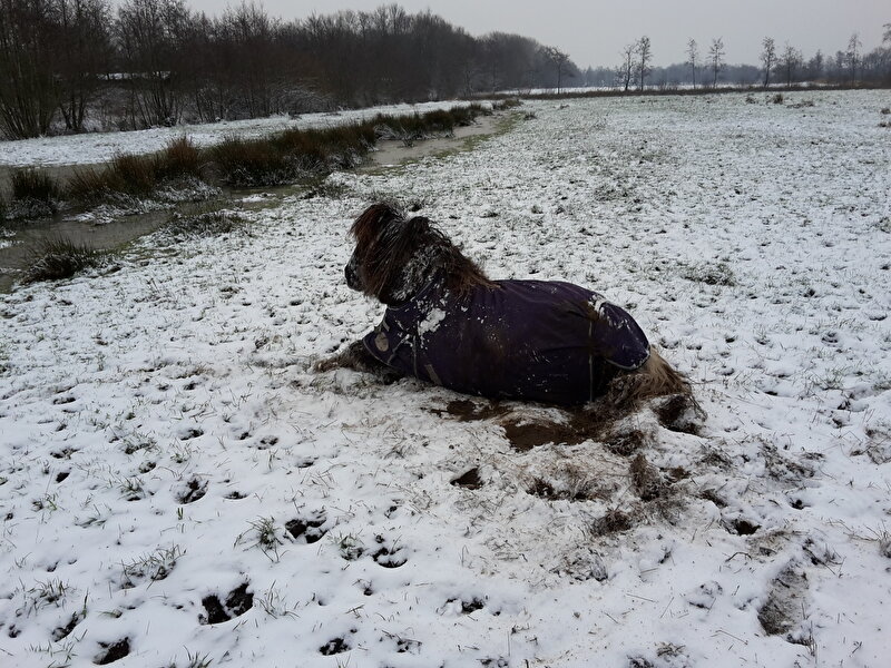 (ikkehouniezovansneeuwgladheidslushuppyzooi)Mijn pony's staan 24/7 buiten, dus ik vroeg me wel even af hoe zij deze eerste nacht van daadwerkelijke winter doorgekomen waren. De jonge welsh had ik gister uit voorzorg toch maar even een dek op gedaan, de shetten zijn wel wat gewend en redden zich wel dacht ik.