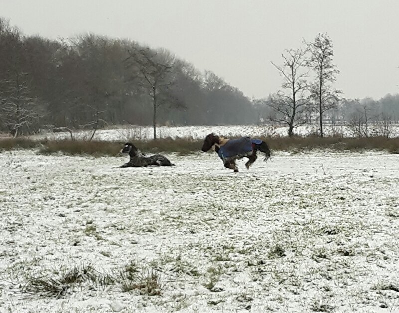 Al glibberend aangekomen bij de weide van de pony's, zag ik in eerste instantie alleen de witte wei, en geen pony's. Nou moet ik zeggen dat ze een flinke weide hebben dus ik ben ze wel eens vaker 'Kwijt'