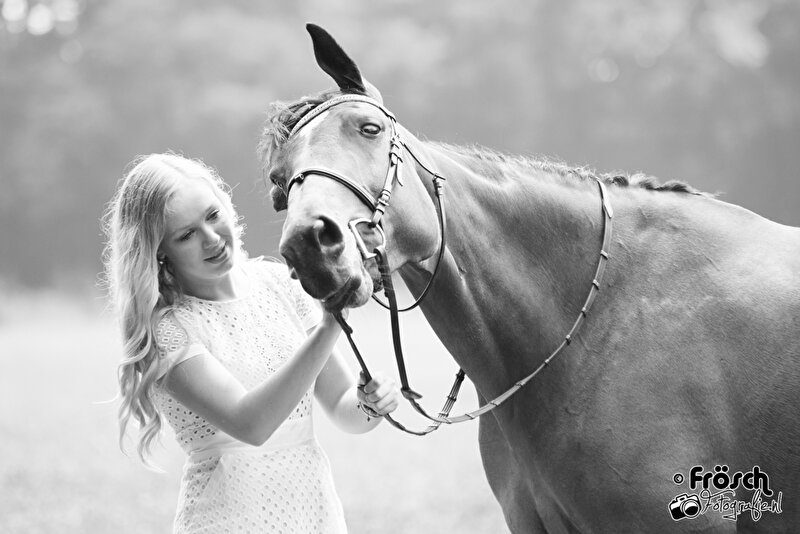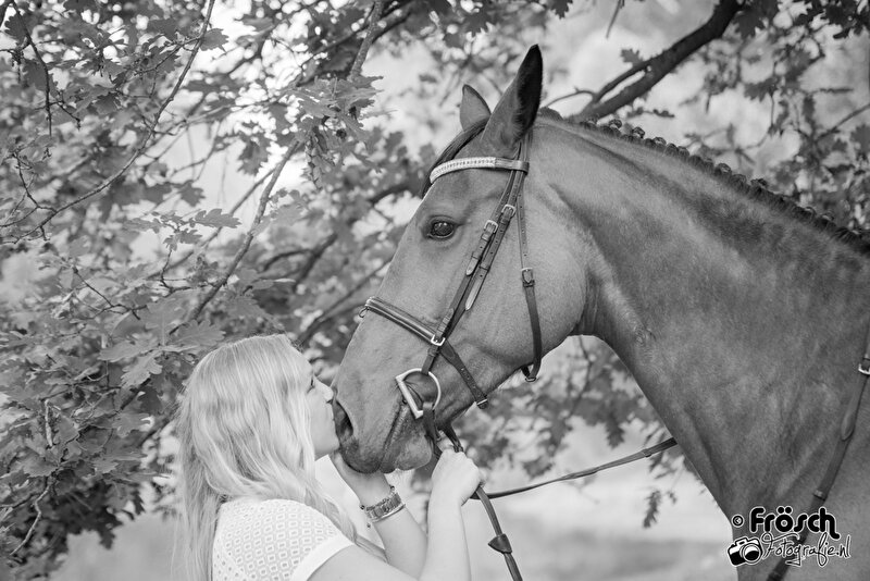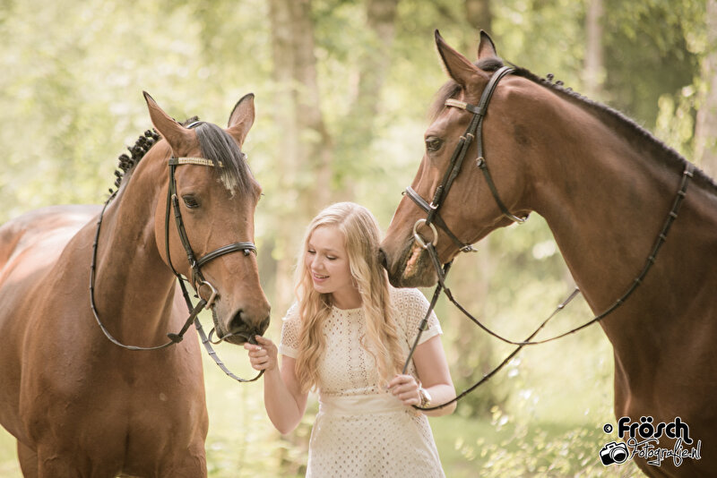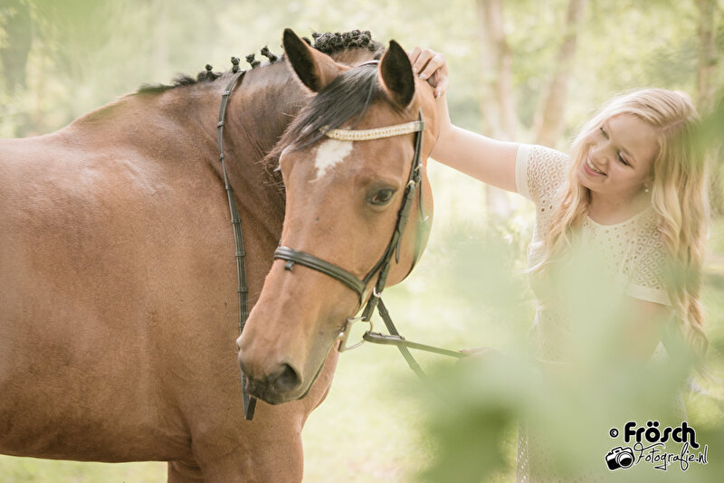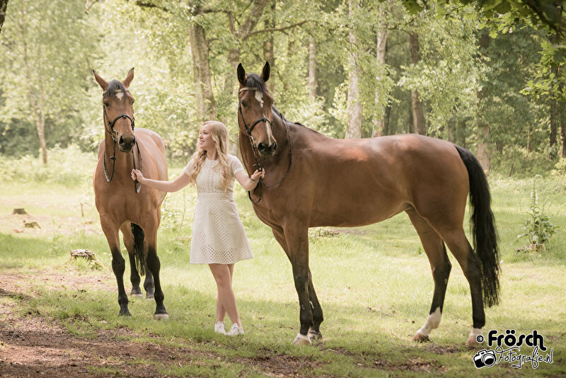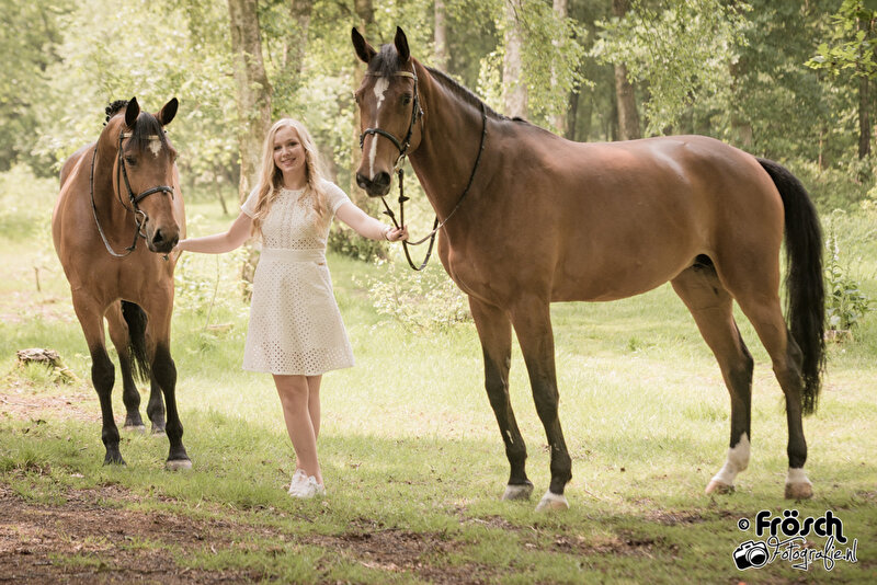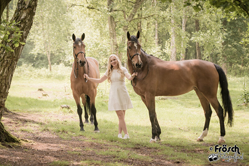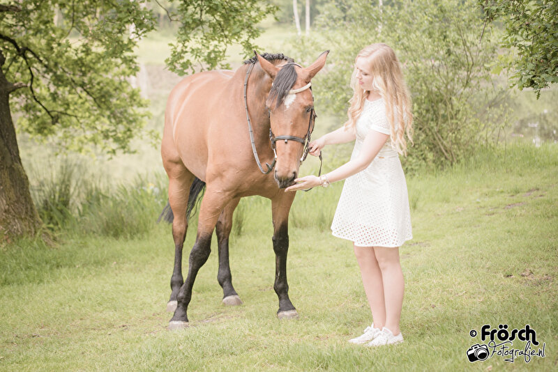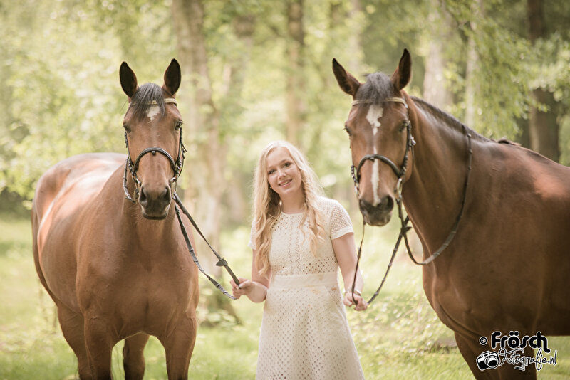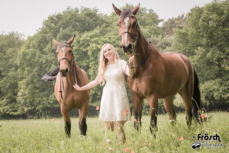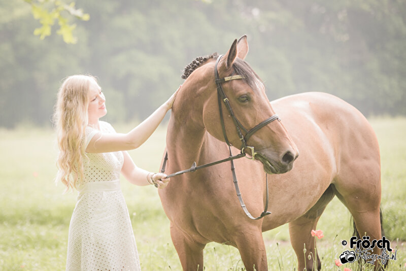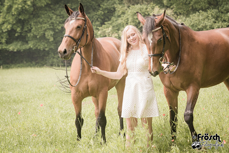 Ik zal me eerst zelf even voorstellen. Ik ben Nadine, ben 19 jaar en rijd al vanaf m'n 7e paard. Ik heb voor mijn 2 paarden ook al meerdere pony's gehad, maar nog nooit echt foto's laten maken van ze. Nu was ik 4 mei jarig en kreeg ik van mijn vriend een fotoshoot cadeau met mijn 2 prinsessenpaarden. Ik maakte een afspraak met Maartje van Fröschfotografie, bestelde matchende frontriemen voor mijn puppy's via http://www.nikahorseproducts.nl maar 17 euro!! en afgelopen zaterdag was het dan eindelijk zo ver! Ik had Maartje van tevoren verteld dat ik niet teveel wou poseren (ernaast staan en lachen), maar meer spontane foto's wou. Ook wou ik een beetje een "dromerig/sprookjes" thema. Ik vind ze echt heel mooi geworden en ben er ook heel erg blij mee!