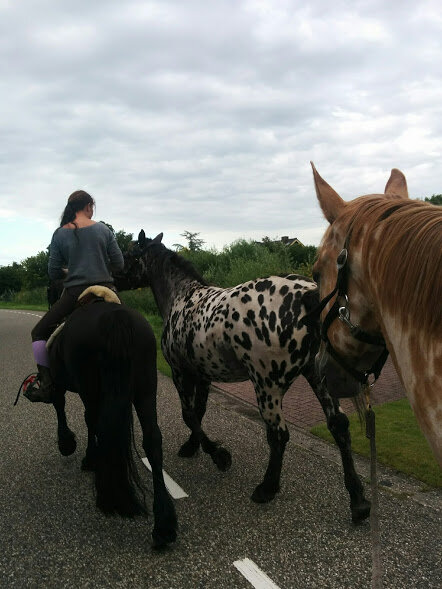 De eerste keer succesvol op pad na onze lessen! Zowaar naar ons eigen bos een paar kilometer verderop haha, maar wat was ik trots. Hij werd ook fijn gesteund door een ervaren paard.