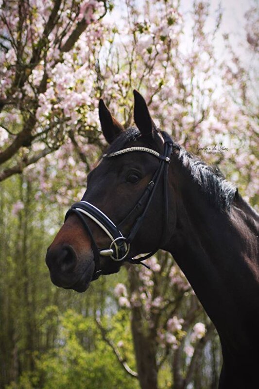 Februari en maart hebben we niet veel gedaan, ze had een ongelukje in de paddock gehad en ik wilde rustig opbouwen om haar de kans te geven goed te herstellen. Haar spieren hadden een flinke opdonder gehad en ze zat ook nog eens helemaal vast.. Dus maken we een sprong naar april! We trainden hier wel fijn weer door en ik zette haar eens op de foto.