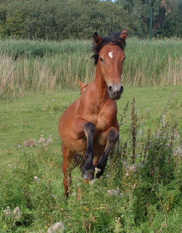 Ze staat hele dagen in de wei, alleen s'nachts staat ze op stal. Verder was dit eenmalig en ik zal niet zeggen dat ze er uit haar zelf overheen ging, maar ik hoefde haar echt niet te dwingen. Als dit wel het geval geweest was, had ik haar niet eens laten springen. Maar ze had er plezier in en deze hoogte valt echt niet te vergelijken met een baby die nog niet rechtop kan zitten en je doet het toch of een puppy of whatever. Ze springt verdorie in het weiland 10x vreemder, en dan is 1x(!!!) vrijspringen slecht voor haar. Sorry, maar overdrijven is ook een vak. Ik vind het prima dat jullie je mening geven(val ik onder de Die-hard bokkers?), ik zal er ook niet tegenin gaan ,tenzij ik het er echt niet mee eens ben of het gewoon niet klopt. Als je de vrijheid hebt om je mening te geven, dan heb je toch ook de vrijheid om er tegenin te gaan? Het valt echt reuze mee met dit paard, en ze hoeft tot haar 3e ofzo eerst niet meer vrij te springen, dus maak er aub niet zo'n drama van!