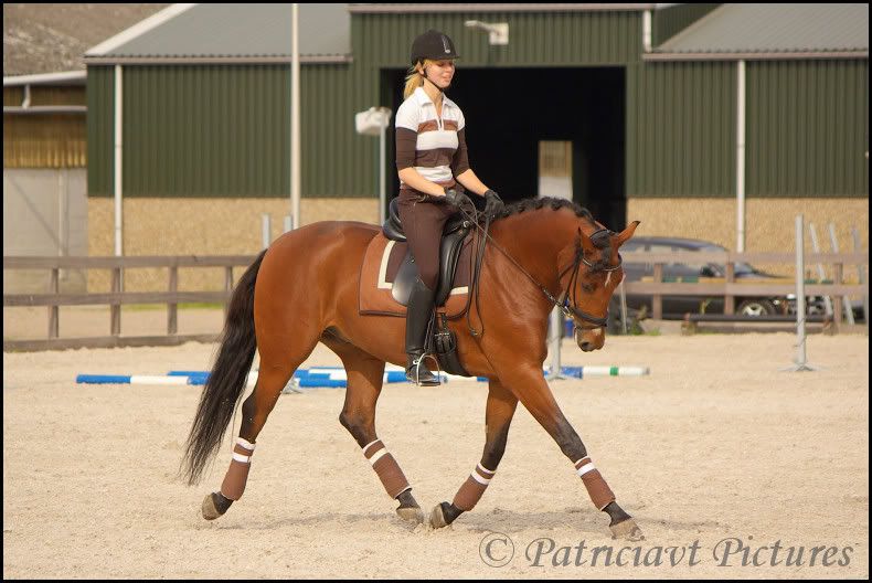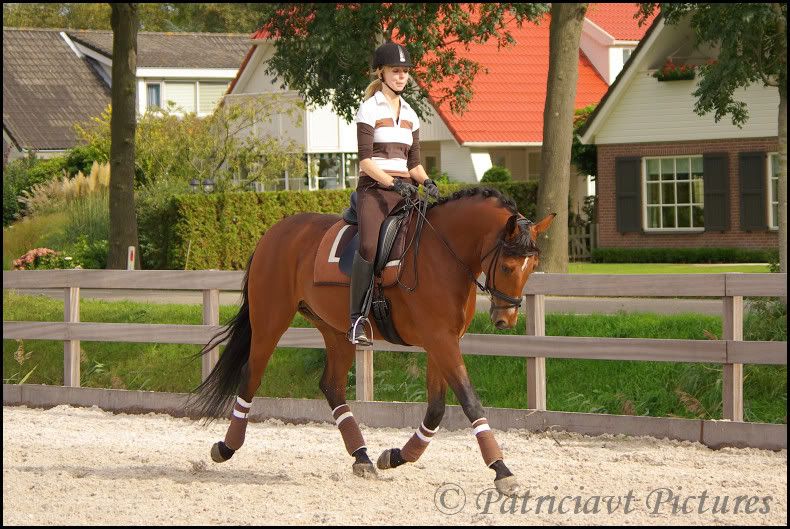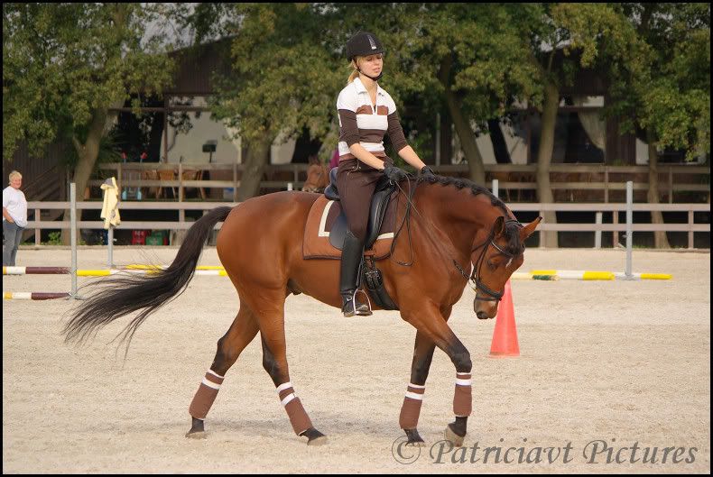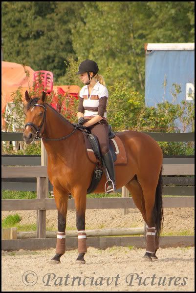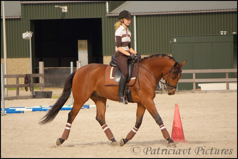 Vandaag liep hij erg goed, maar ik had erg veel last van mijn rug, dus werkte hem nogal tegen. Hij komt erg braaf en goed terug op mijn zit, maarja, als zitten pijn doet, gaat hij rennen. Dat vang ik nog wl eens teveel op met mijn handen. Zijn er hard op aan het trainen, maar normaal heb ik niet zó veel last