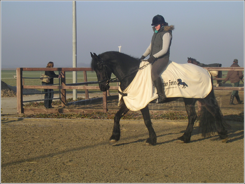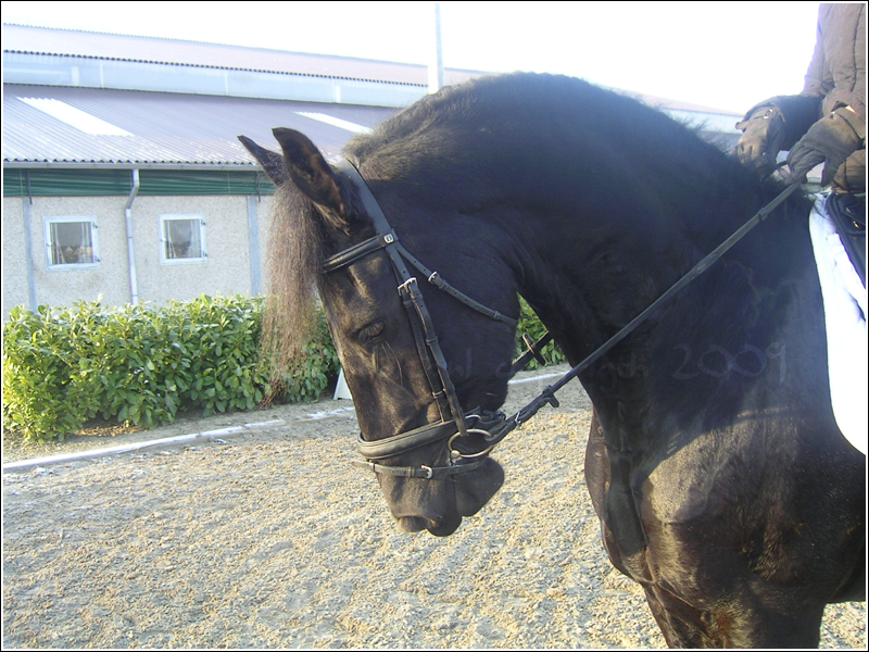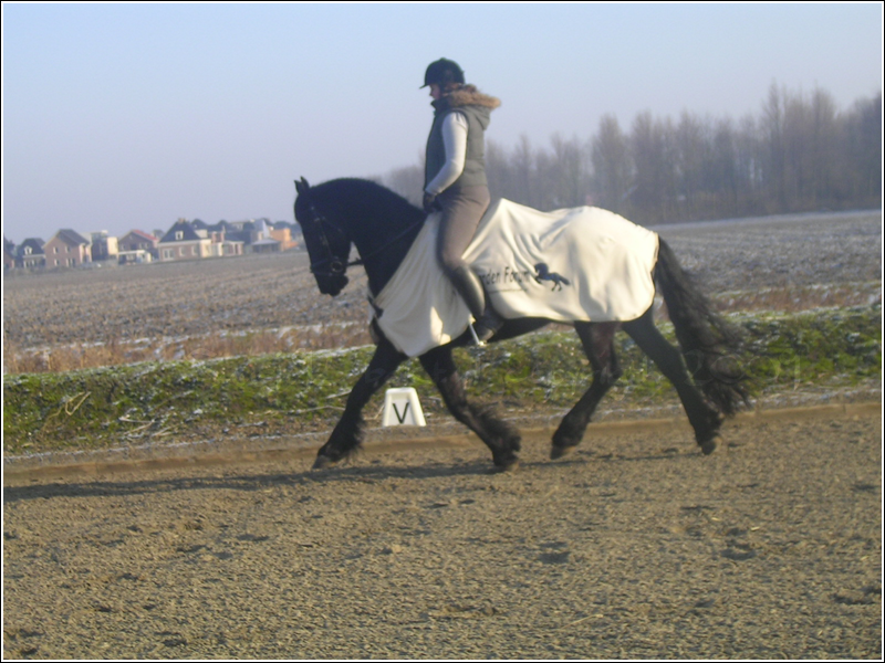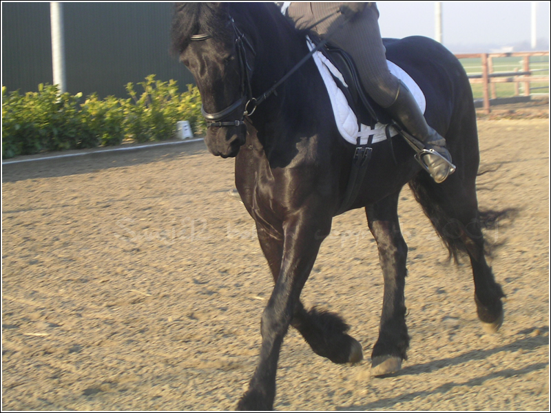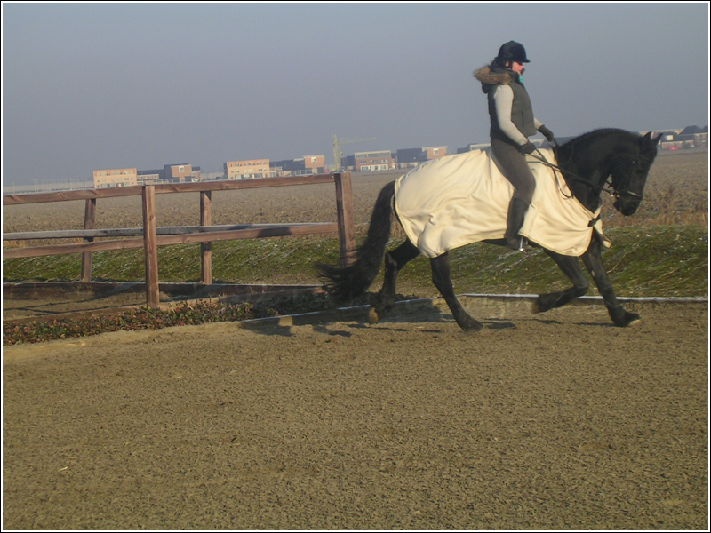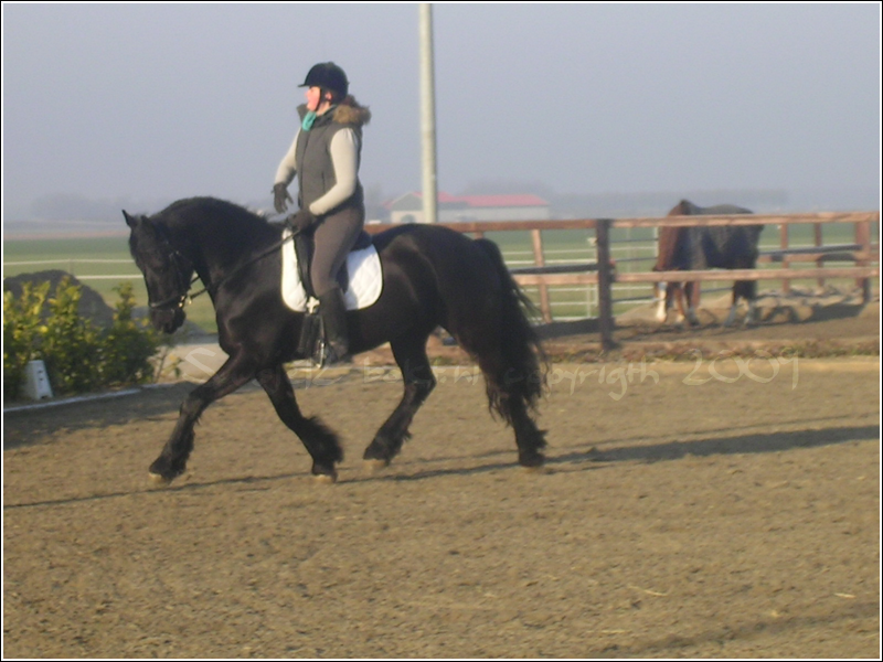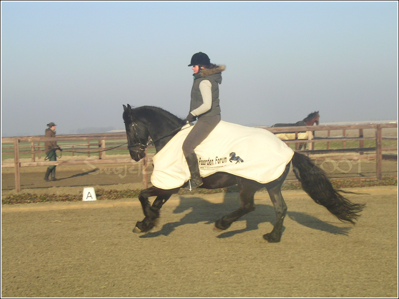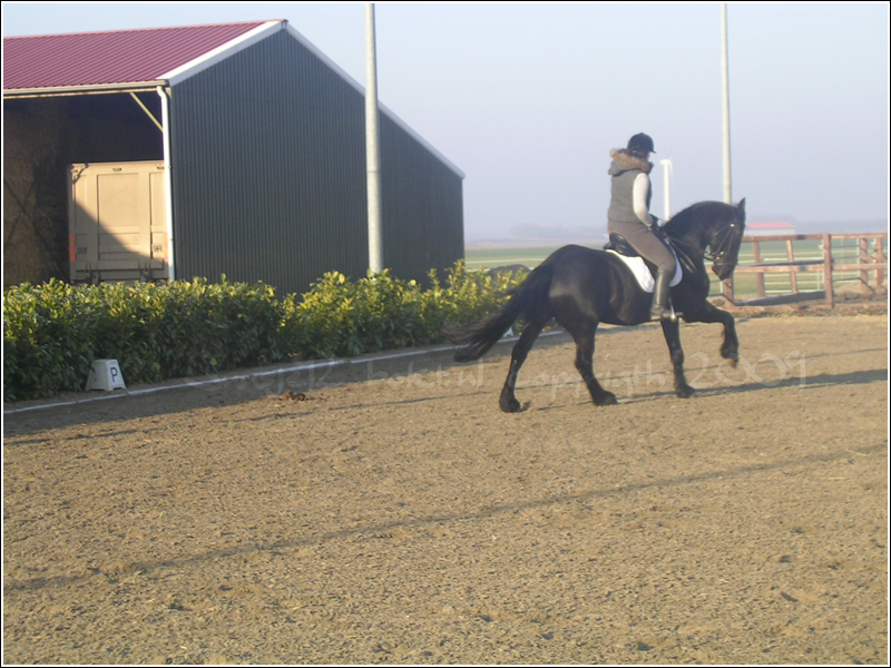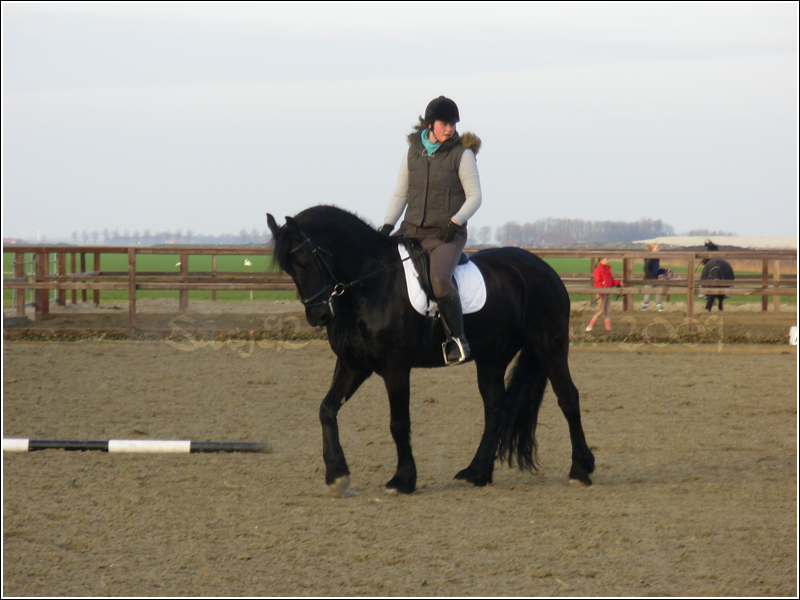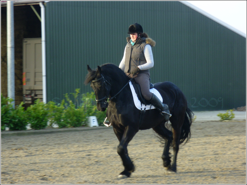 . Allereerst zet je je handen al gauw vast op 1 plek; houd je handen rechtop en bij elkaar net iets boven de schoft. Het lijkt ook wel (dit kan ik fout hebben) dat je met je teugels stuurt; sturen moet je doen met je benen en met je gewicht! Het enige wat je met je teugel kan vragen is stelling van het hoofd. Dus op voltes; houd je buitenteugel erbij zodat ie niet wegloopt over de buitenschouder en houdt je binnenbeen lang zodat je paard om je binnenbeen buigt, met je binnenteugel geef je enkel alleen wat kleine ophoudingen voor de stelling. Met je gewicht kan je je paard ook sturen. Geef maar eens wat meer druk op je rechter- of linkerstijgbeugel; je zal zien dat je paard ook meer die kant op zal gaan. Daarom is het zo belangrijk dat je recht op je paard blijft zitten en ik heb het idee dat je vaak niet helemaal recht zit. Enne; kijk naar voren en niet naar die mooie nek die je Jesse heeft!