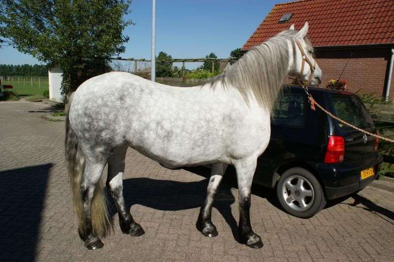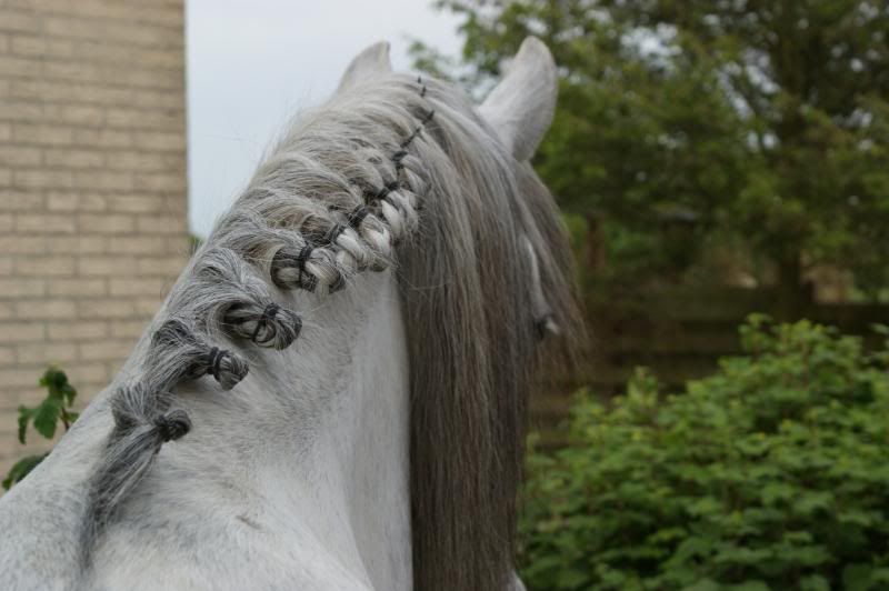 eerst had ik geprobeerd knotjes te maken, maar ze heeft zulke lange manen, het is toch een hengstenvlecht geworden.