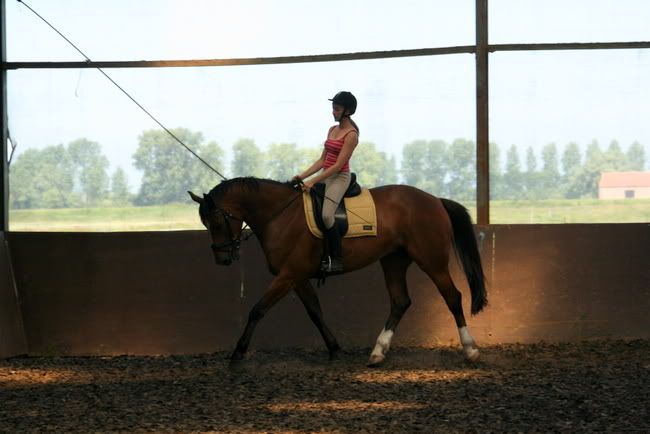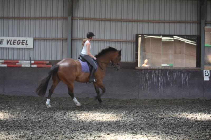 eus moet leren (en ik ook) om nageefelijk te blijven in zijn overgangen (vooral naar galop). *Vroeger was hij erg lui, maar dit is nu al stukken beter, hij zou echter nog een beetje beter aan het been kunnen zijn.