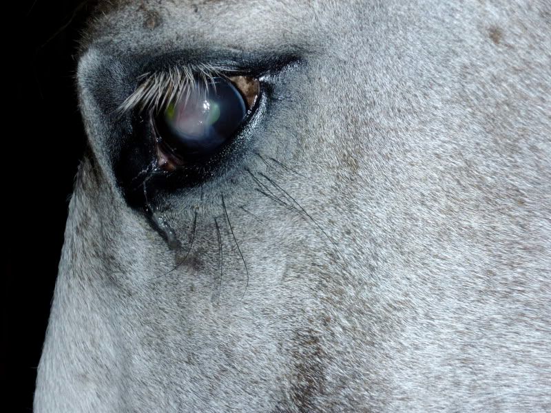 En ze had op allebei haar ogen een letsel. Ze mocht geen licht zien, moest binnen in een donkere stal staan en moest om de 2u oogdruppels krijgen. Ze was op haar linker oog volledig blind, en op haar rechter oog had ze wel nog zicht, maar het werd ook steeds erger. Toen heeft ze 1,5dag bij de DA gestaan en kreeg ze om de 2u medicatie toegediend. Het letsel werd steeds groter en groter en het zag er niet goed uit. Dus dan hebben we haar maar direct naar de kliniek gebracht. Hoe die letsels daar opeens zo gekomen zijn weten we (nog) altijd niet. Er kwam niets uit de onderzoeken en de dokters daar hadden nog nooit zoiets geweten. Het enige wat ze me als uitleg kunnen geven is dat er waarschijnlijk één of andere bacterie via een vlieg in haar oog is gekomen. Maar het rare was dan nog dat het op allebei haar ogen was. Dus een deftige verklaring voor heel dit gebeuren hebben we nooit gekregen. Het heeft er een hele tijd echt niet goed uit gezien en ze dachten toen aan opereren (het derde oogvlies vastnaaien), maar gelukkig hebben ze het kunnen oplossen met medicatie ed. Ook was de communicatie tussen de artsen daar niet optimaal waardoor er enkele misverstanden gebeurt zijn. Nuja, alles is terug in orde. Haar zicht op haar rechter oog is terug volledig goed, op haar linker oog zal ze altijd een bepaald punt hebben waar ze niets meer kan zien. Maar verder hebben we er geen last meer van.