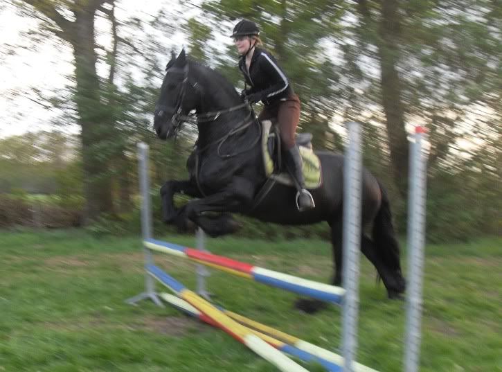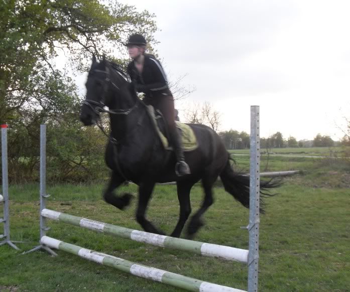 op de foto te zien ga je eerder te weinig meegeven dan te veel, probeer ook daar wat aan te werken. dan zal hij zijn neus ook wat laten zakken op de sprong zelf