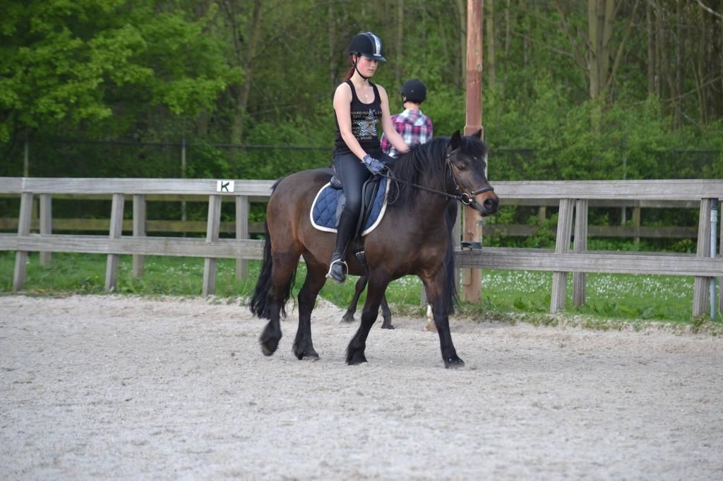 Doordat hij wat sneller bij de kinderen wordt gebruikt wordt er weinig gewerkt aan zijn ontspanning, daarom rijdt ik hem nu om hem wat losser te krijgen. Natuurlijk heb ik gewoon les met hem en hij wordt gereden met een dubbel gebroken bitje.
