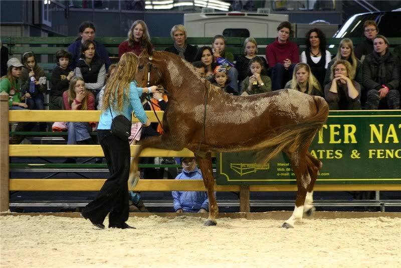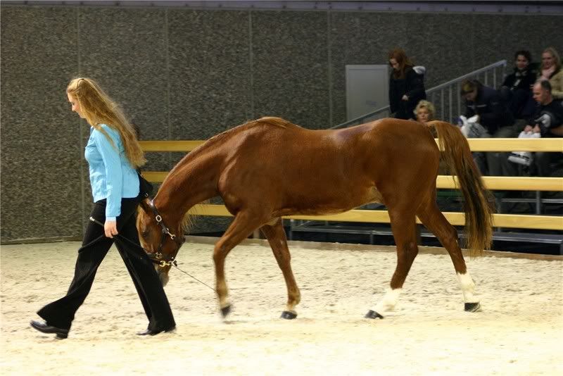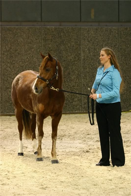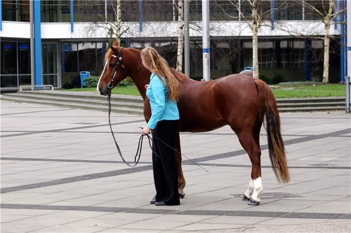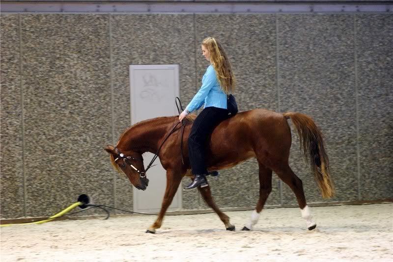 Daarna mezelf omgekleed en Sjors klaargemaakt. Het personeel liet me daar de ring vast in, zodat ik hem even los kon rijden, dat was wel super! Buiten had ik al wat gestapt op het pleintje, maar daar stond een flinke wind. Binnen moest ik zelfs uitkijken dat ik hem niet moe en bezweet reed, onder die felle lampen. Wel jammer dat ik Sjors met aanleuning moest rijden, normaal kan ik hem voor wel los gooien en op zit rijden, maar hij was verschrikkelijk heet, en dus voorwaarts. Zodra je hem iets oppakt kruipt hij heel gauw achter de loodlijn.