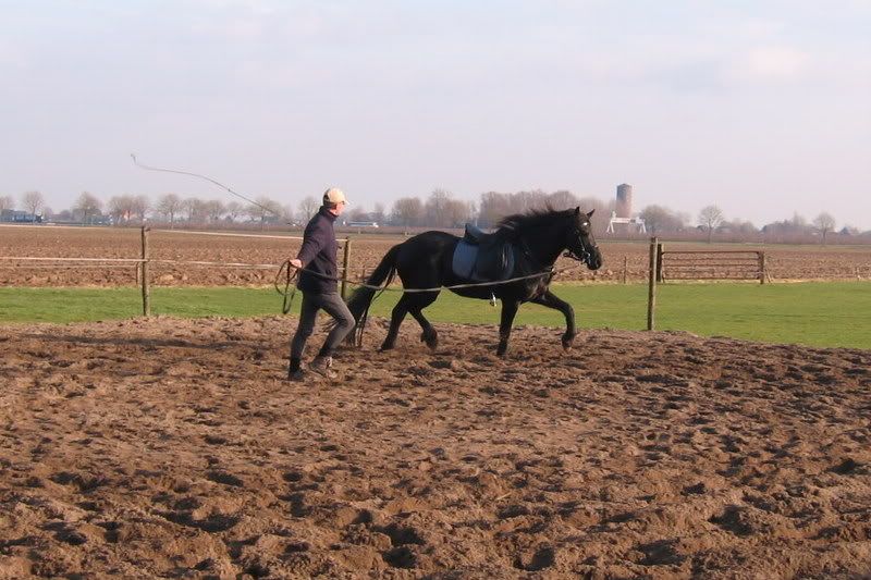 Eerst even aan de longeerlijn. Aan de oortjes is te zien dat ze helemaal in haar hum is