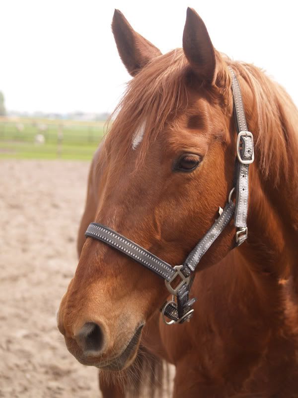 Neusriem zit inderdaad te laag, maar het was al zo'n probleem, en dit hoofdstel was het makkelijkst dichtmaken etc, aangezien ze al heel weinig aan haar hoofd accepteerd, en een aansnoerneusriem zou veelste dik zijn, en veelste veel gepiel vast te krijgen. Knipoog (hoger kon deze niet)