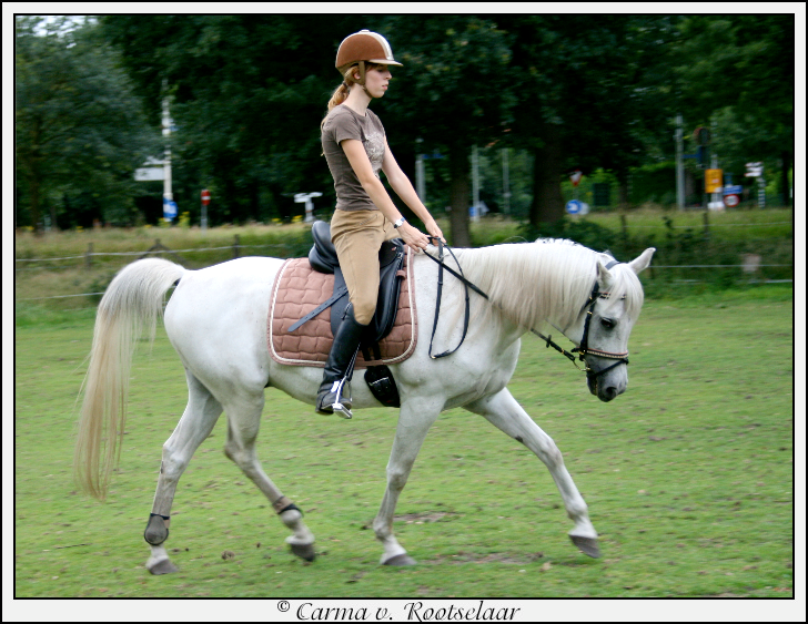 Niveau hebben we niet echt, nooit wedstrijden met hem gereden, maar denk dat we op ongeveer B niveau rijden