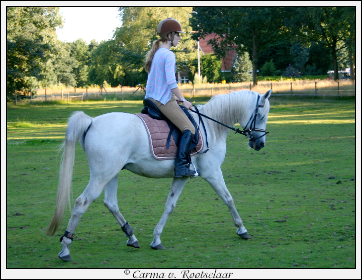 Hij had eerder altijd dat hij erg op de voorhand valt, nu vind ik dat wel meevallen, maar daar let ik dus ook veel op. Mijn houding is nu het punt van aandacht.