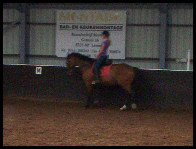 Ludo is een kwpner die ik vanaf september 2007 lease op de Alida manege in echtenerbrug, ik rijd hem nu drie keer in de week. Voor dat ik Ludo begon te leasen heb ik er voorheen al 4 jaar op gereden, ik heb hem van een echt manege paard naar een paard gereden die nu lekker nagefelijk kan lopen! Hier zelf ben ik ook erg trots op, en we hebben van elkaar erg veel geleerd en we leren nu nog steeds meer van elkaar! Af gelopen zaderdag is mijn vriend mee geweest naar de manege om foto's te maken van het rijden, alleen jammer genoeg is mijn vriend niet zo handig met een camera. En de foto's zijn er niet mooier op geworden omdat ze ook nog eens binnen gemaakt zijn. En de meeste foto's zijn ook nog van het instappen omdat de batarijen na 20 minuten oprakten. Ik hoop dat ik de volgende keer wat betere en scherpere foto's van Ludo en mij kan tonen.