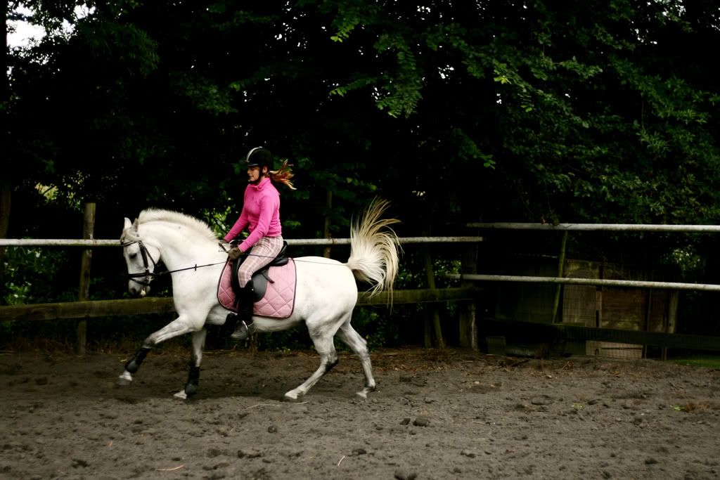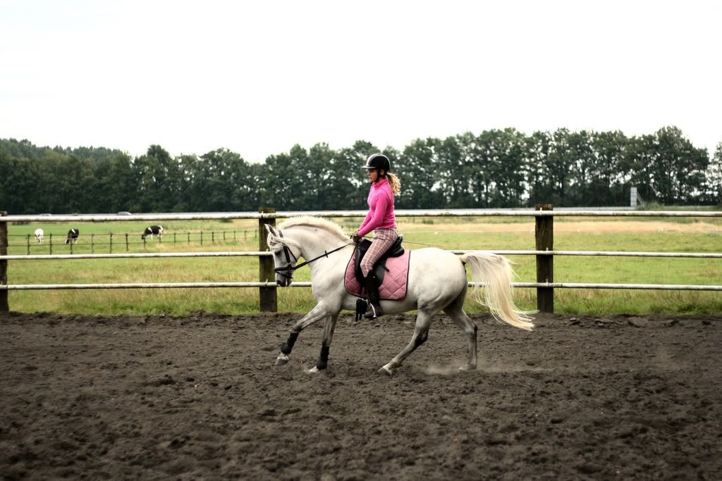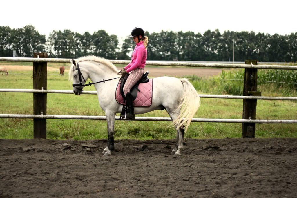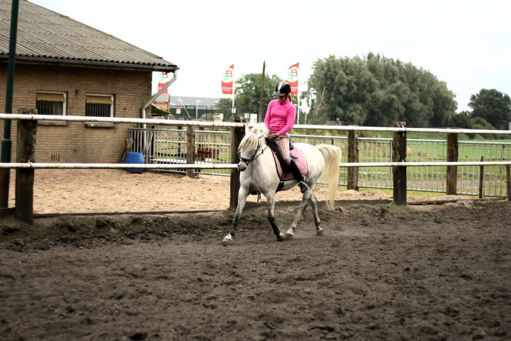 Ik heb het probleem dat ik mijn benen té ver naar achteren leg en daardoor naar voren ga zitten, we oefenen dit door veel zonder beugels te rijden en stukjes te doorzitten.