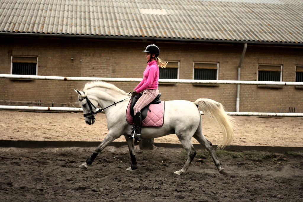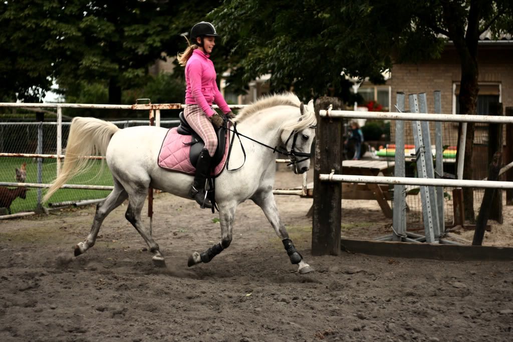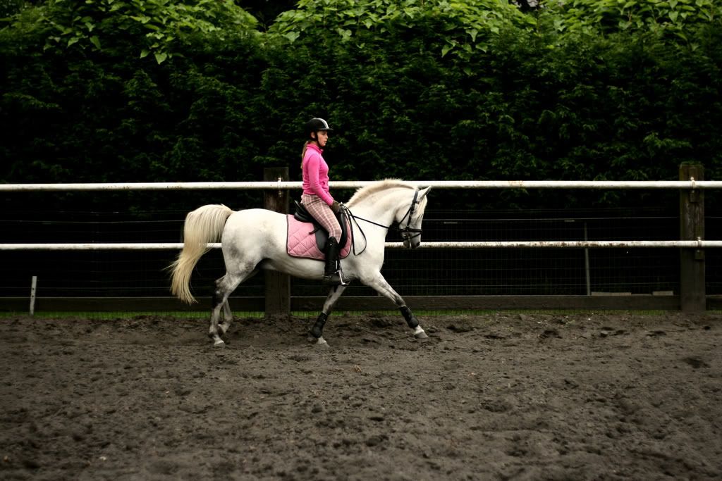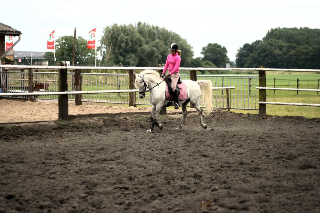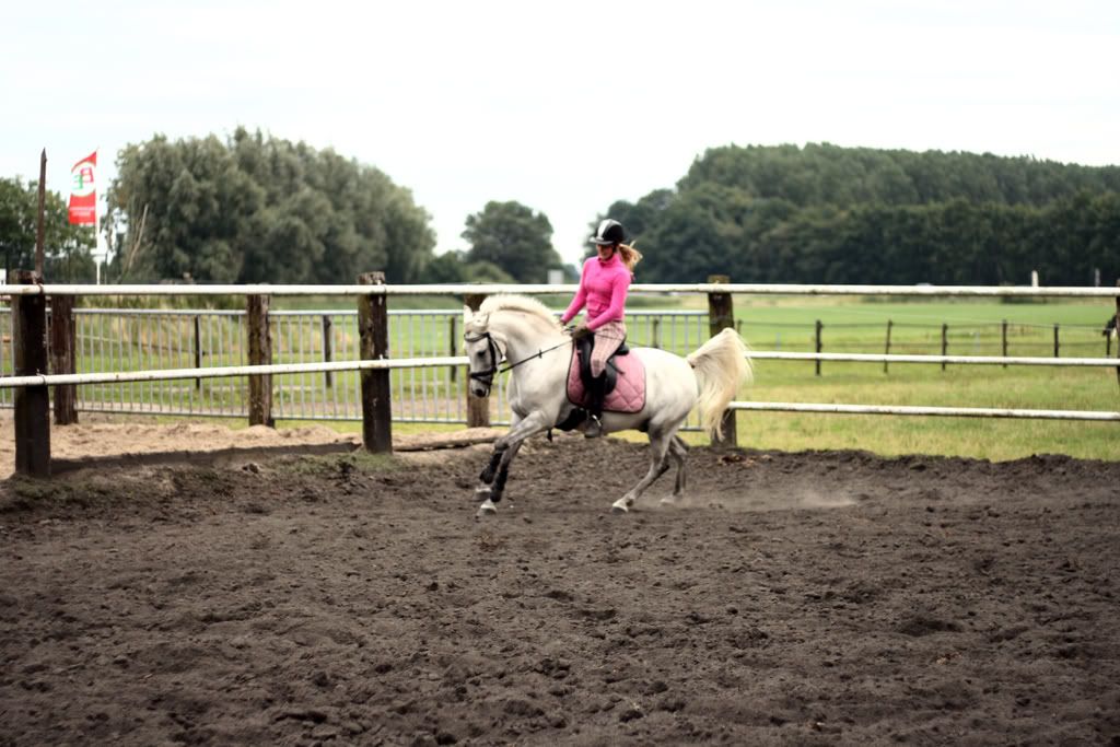 Ik heb het probleem dat ik mijn benen té ver naar achteren leg en daardoor naar voren ga zitten, we oefenen dit door veel zonder beugels te rijden en stukjes te doorzitten.