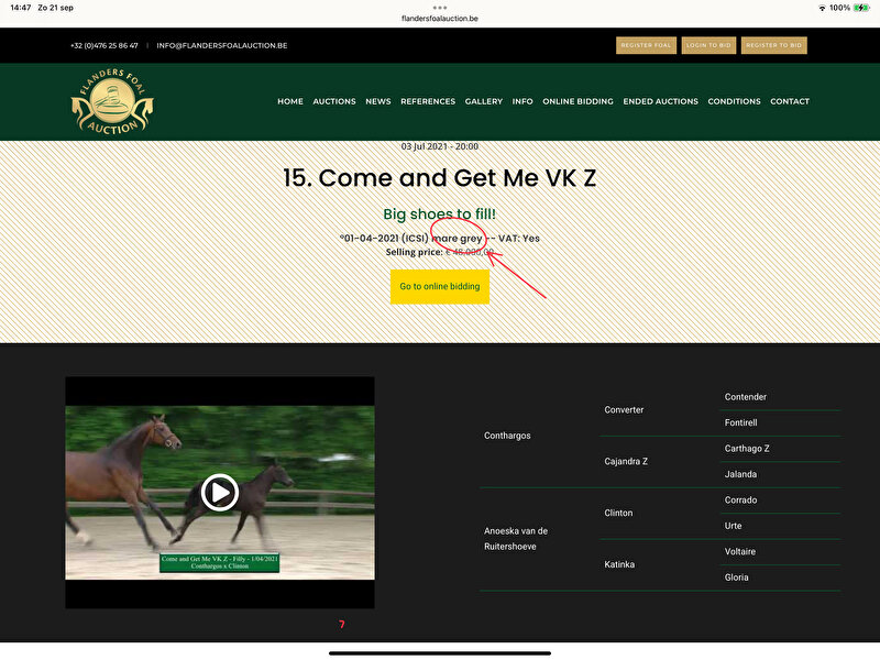 gomir schreef:Zo werkt het niet met veilingen, je kunt daar geen voorwaarden stellen en onderzoek laten doen als potentieel geïnteresseerden. Alle veulens worden normaal gesproken gecontroleerd door dierenarts, maar op correctheid van vermelde afstamming en oudergegevens moet je kunnen vertrouwen (inclusief vermelding van et/icsi).