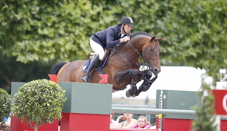 De foto is genomen tijdens een vijf sterren wedstrijd in Parijs. In het parcours gleed het kopstuk over de oren van de hengst af. Whatelet wist het parcours alsnog uit te rijden en eindigde op een negende plek.