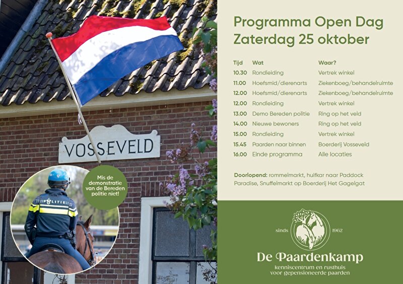 Op zaterdag 25 oktober zet Stichting De Paardenkamp in Soest de staldeuren weer open voor het publiek. Tijdens deze feestelijke Open Dag en Snuffelmarkt valt er van alles te beleven op Boerderij Vosseveld en Boerderij Het Gagelgat. Van demonstraties met politiepaarden tot poffertjes, van hoefsmid aan het werk tot schminken en hobby horse-races. Een gezellig dagje uit voor jong en oud!