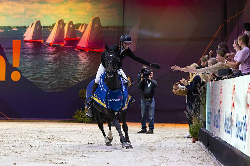Eindelijk is het zover. Na vele voorrondes, heel veel starts en heel veel rekenen worden vandaag de Horses2fly finales gereden. Natuurlijk in het schitterende WTC Expo in Leeuwarden. De ruiters en amazones in de klasse 1m10 mochten het spits afbijten en daarmee tevens het springweekend van Indoor Friesland 2025 openen. Veertig combinaties kwamen aan de start in deze klasse en maar liefst de helft mocht terug komen voor de barrage. De winnares werd net als vorig jaar in deze rubriek de pas vijftienjarige Amber Kiewiet. In het zadel van de tienjarige merrie Glow of Fire van ’t Vhij (v. Latour VDM), kwam ze over de finish in 30.99 seconden.