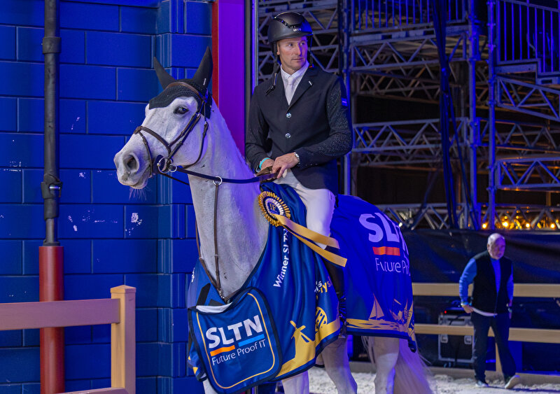 De tweede proef op de vrijdag van Indoor Friesland 2025 voor de drie sterren ruiters zit er ook op. Er gingen 44 combinaties van start en wederom bestond de top drie uit Nederlandse combinaties. Gisterenavond won hij de kwalificatie voor de Grote Prijs en nu voegt hij daar de overwinning in de SLTN Prix over een hoogte van 1.45m direct op tijd aan toe. Michael Greeve en de achtjarige ruin Rubens (v. Luganer) kwamen over de finish in 52.57 seconden wat genoeg was voor de overwinning.