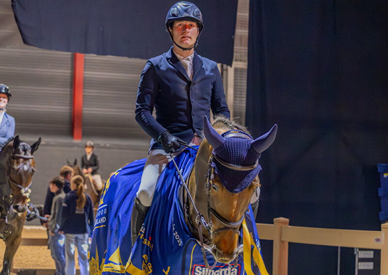 De laatste dag van Indoor Friesland 2025 is begonnen. De finale van de één ster Small Tour is zojuist verreden, de Sijperda Verhuur Prijs, een klassiek parcours met barrage over een hoogte van 1.25m. Er gingen 55 combinaties van start waarvan er vijftien terug mochten komen voor de barrage. Hij had er al diverse keren bij gezeten in de prijsuitreiking, maar hij wist nog geen overwinning te behalen. De dames waren dit weekend tot nu toe te snel. Age Flapper won met de zesjarige merrie Okittaire (v. Arezzo VDL) in de tijd van 27.51 seconden de finale van de Small Tour.