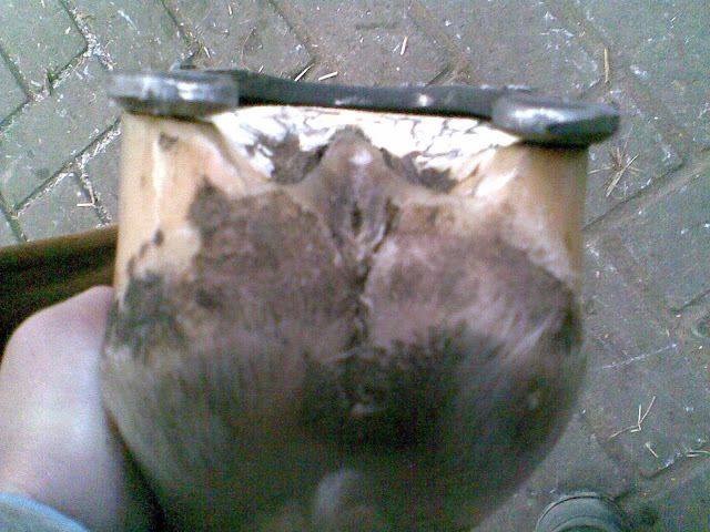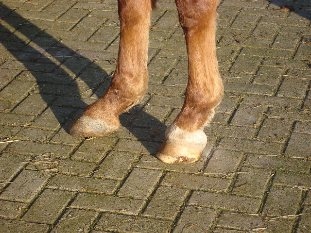 , jouw paard heeft bijna cilinder vormige hoeven, ik wil niet weten hoe het er van binnen uitziet en hoe weinig ruimte het hoefbeen nog heeft.