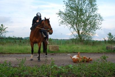 Zo moet je een hond dus niet trainen om met een paard om te gaan. De hond heeft totaal geen respect/afstand ingebouwd tegenover het paard. Als deze hond een ander vreemd paard tegenkomt hoop ik dat je hem goed onder appel hebt, want anders voorzie ik ernstige ongelukken.