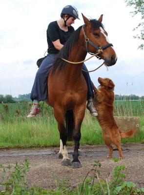 Ibbel schreef:Ik denk dat je al veel kunt leren aan een hond door 'm eerst naast de fiets mee te nemen. Daar zit die barriere van wielen en kettingkast wel naast 'm, je kunt 'm aan de riem houden (of vastmaken aan een Springer of Dogrunner), en dan eerst trainen los naast de fiets te lopen. Tegelijkertijd vanaf de grond ook al wennen aan paarden, en dan zodra hij naast de fiets goed gehoorzaam naast loopt, én niet meer op het paard reageert vanaf de grond, los meenemen naast het paard. Naast paard aan de riem zou ik nooit doen. Hond hoeft maar één keer rond een been te draaien en je ligt samen gestrekt. Uh, met z'n drieën gestrekt.