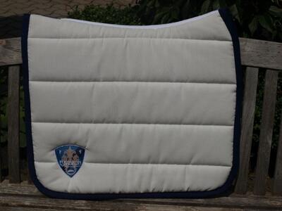 De titel zegt het eigenlijk al. Ik ben opzoek naar een wit full dressuur zadeldek met een blauwe bies.