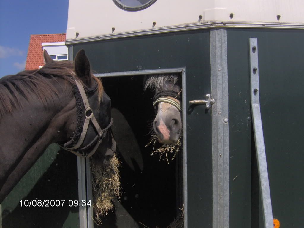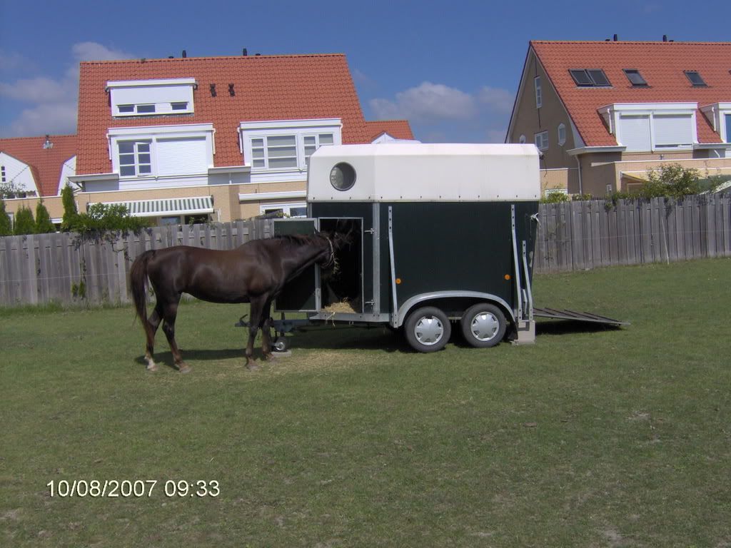 Ze steigerde heel hoog en bleef maar steigeren, dus wij met een longeerlijn proberen haar er in te krijgen. en toen steigerde ze heel hoog, maar me vader gaf een klap op dr kont met de longeerlijn, en toen sprong ze de trailer in.