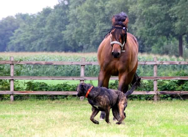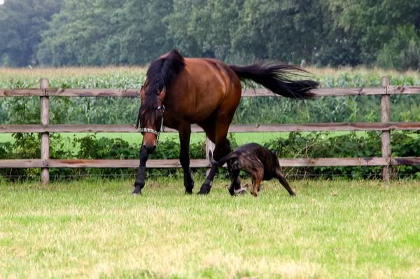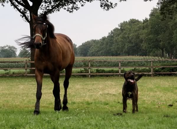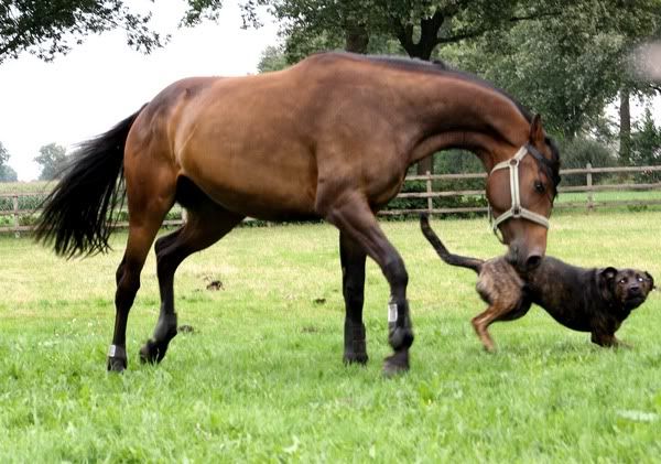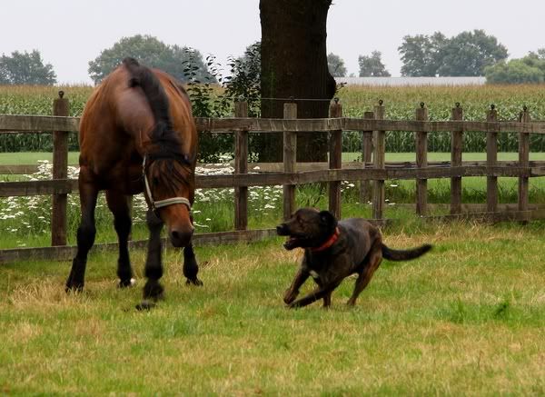 Wat toevallig! Mijn paard moest hem niet en gaf hem af en toe een duw maar ik mag aannemen dat Gijs hier zelf niet moeilijk over doet. Gijs weet dit ook en Boris heeft een aantal maal een trap gehad hoor, maar hij blijft dit doen! _Chendo_ schreef:Wij hebben een hond die niet zo lief is tegen andere honden (Athans, dat is heel verschillend, 70 % vind ze wel lief, maar ze kan ineens uitvallen, ze zal niet doorbijten, maar kan natuurlijk wel een gemene wond van komen). Als een andere hond los loopt en naar haar toe komt en zij is aangelijnd en ze eet hem/haar op ben ik niet verantwoordelijk. Had immers mijn beestje aangelijnd en waarschuw ook altijd even. (Zijn er nog zo mensen die zeggen, "Mijn hond doet niks hoor". Nee joh, maar de mijne wel!!)