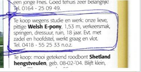 Nu met de naam Merlyn, heette bij de vorige eigenaar Sultan. Hij heeft een schofthoogste van +/- 1,55. In zijn advertentie stond hij als Welsh te koop, maar wij zijn er vrijwel zeker van dat het een draver is. Hij is in een zomer bruin en in de winter donkerbruin. Heeft mogelijk in Well gestaan. Geboren op 21-03-1986. Ik hoop dat ik iets meer van zijn verleden te weten kom! Pb box staat altijd open!