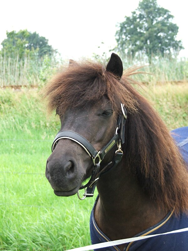 Ze is zwart/bruin met stekelharige vacht, schoftmaat 1.10. We denken een kruising shetlander/ijslander.