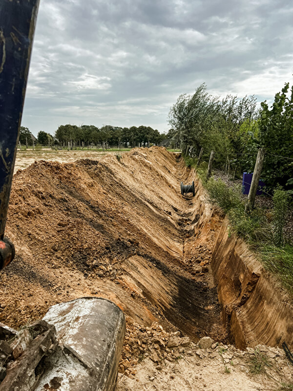Het nadeel van op zand zitten, is de mulle rijbak. We hebben alles geprobeerd (behalve vlokken, dat zakt zo weg de grond in), maar er is geen beginnen aan. De bak gaat dus op de schop! Hier komt veel anders moois. De poel die je op de foto’s hierboven ziet, gaat ook weg. Rondom de poel is de enigste plek die in de winter nat is, dat willen we anders dus gaat ‘ie weg en wordt het een mooie grote paddock met natuurlijk bomen/struiken. Hier staan ze ‘s nachts ook ivm de wolven, dus nóg meer ruimte.