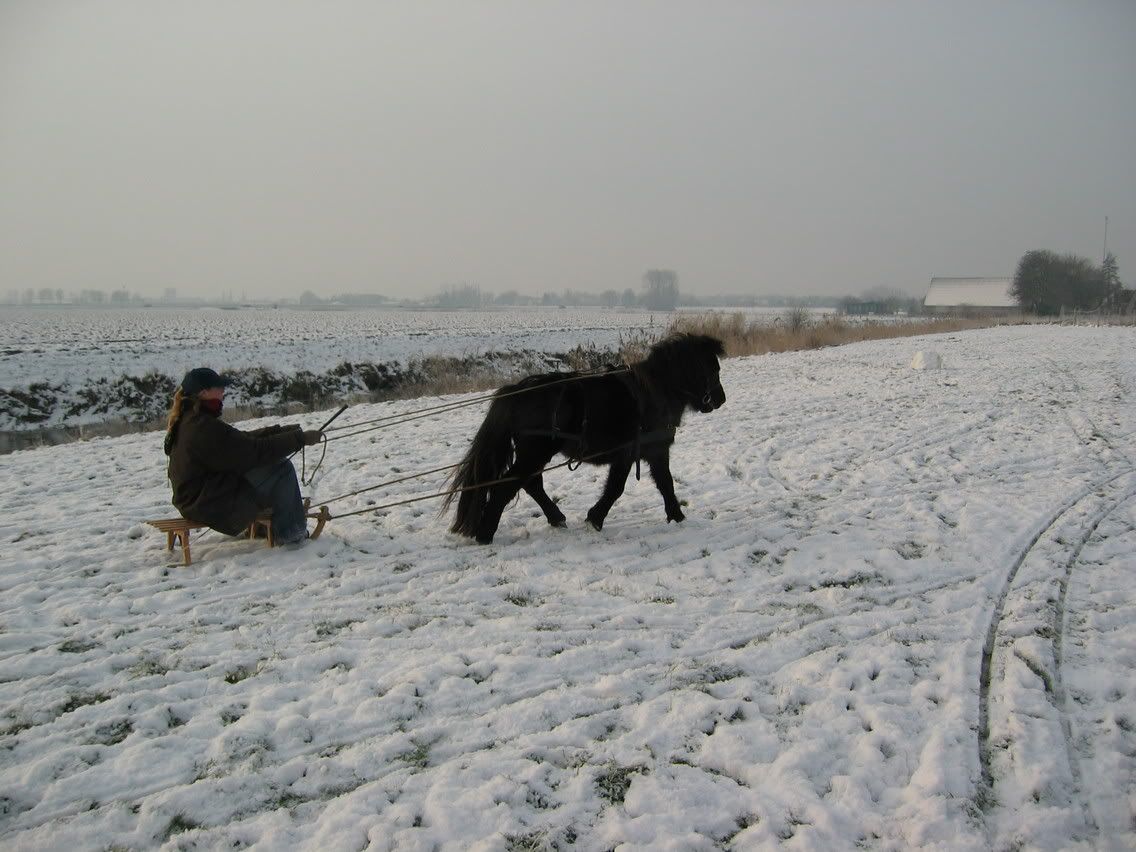 Met een longeersingel gaat prima hoor, zoals ik al zei glijdt zo'n slee makkelijk over de sneeuw en komt er geen kracht bij kijken. Blijft prima zitten en chico vond het prima.