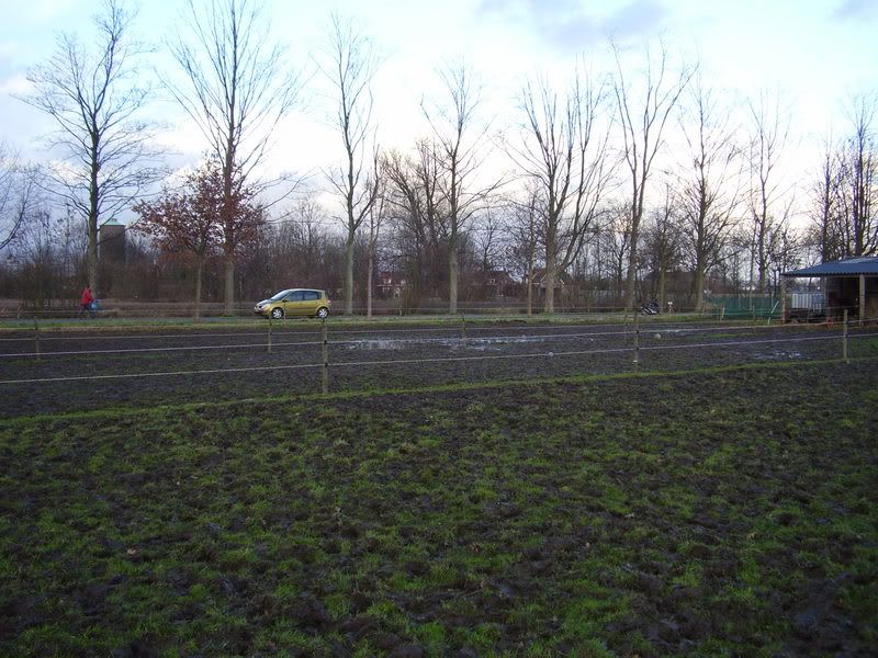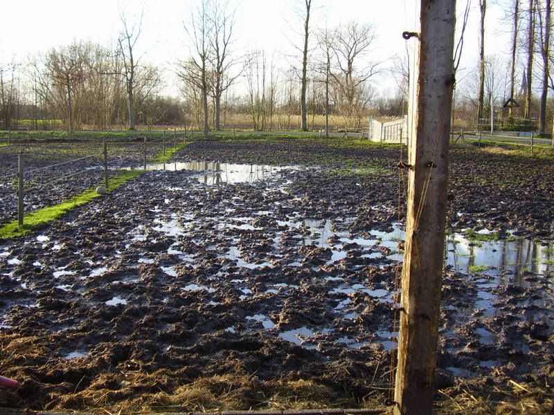 Voor het afdak een wei waar ze zo in kunnen lopen.Deze is erg nat en op een stuk grote plassen.
