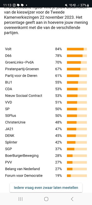 De reden waarom ik dit best interessant vind, is omdat iedereen heel verschillende resultaten heeft, maar de kans op 100% voor één partij en nul % voor een andere partij naar mijn idee niet heel groot is. Bij de meeste mensen zal er zelfs nog een percentage overeenkomst elke partij zijn, ook met de PVV, fvd, of juist PvdD bij iemand die juist heel rechts stemt. Dus hoewel iemand helemaal niets met een partij of partijleider heeft, betekent dit niet automatisch dat een partij helemaal geen standpunten heeft waar iemand (ongemerkt) wel achter staat. En dat vind ik dus wel iets om over na te denken. Dat er vaak ook overeenkomsten zijn en dat hierin ook verbinding gezocht kan worden, in plaats van dat alleen over meningsverschillen de strijd wordt aangegaan. (alhoewel dat laatste vaak met veel meer passie zal gebeuren.)
