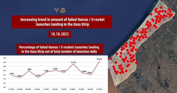 Hieronder is een plaatje van lokaties en percentages uitvallers in Gaza (data komt van IDF, Israelische Defense Force). Aan de percentages te zien moeten er inmiddels honderden HAMAS raketten in Gaza zijn geland.
