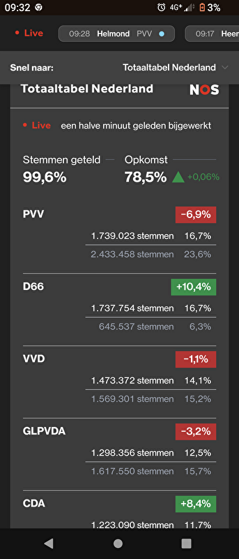 Ook Venray (vorige keer 27,9% PVV en 5,6% D66) en Epe (vorige keer 24,5% PVV en 4,6% D66) moeten nog binnenkomen.
