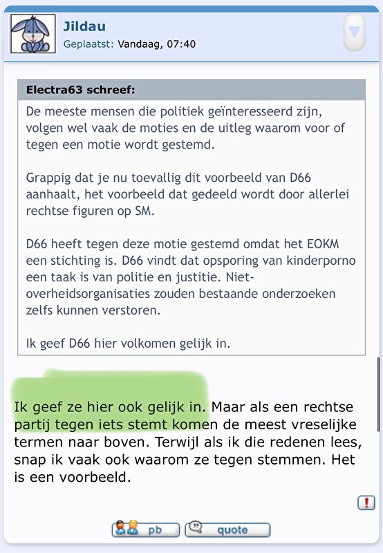 MarlindeRooz schreef:Ik wil ook niemand zijn stemgedrag veranderen. En ik hoef ook met niemand in discussie te gaan over waarom ik radicaal rechts, racisme, inperken van de rechtstaat en het beperken van vrouwenrechten afkeur. Oh en tegen je eigen rechten stemmen vind ik dom ja.