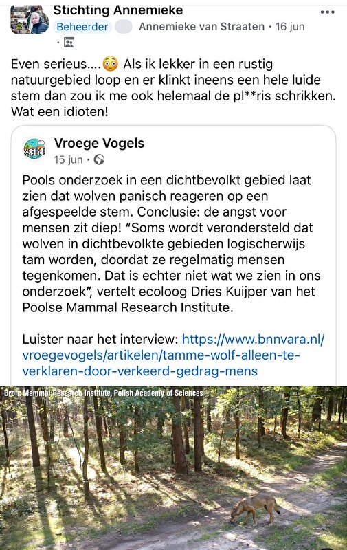 tienus63 schreef:MairiMacBran schreef:Ik krijg het artikel niet geplaatst maar op de RTL nieuwsapp staat een artikel over een onderzoek in Polen waaruit blijkt dat bijtincidenten door wolven komen door “verkeerd menselijk handelen” en zouden wolven wel degelijk schuw zijn en mensen zoveel mogelijk ontwijken.