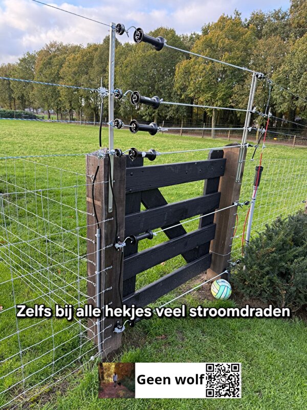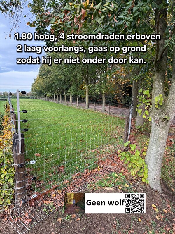Schapen staan achter wolfwerend hekwerk 1,80 hoog met 4 stroomdraden boven en 2 stroomdraden voor langs en gaas bij de grond zodat hij er niet onder kan.