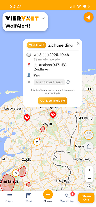 Stuur meldingen z.sp.m naar Wolvenmeldpunt GW +31 6 17018889 via WhatsApp.