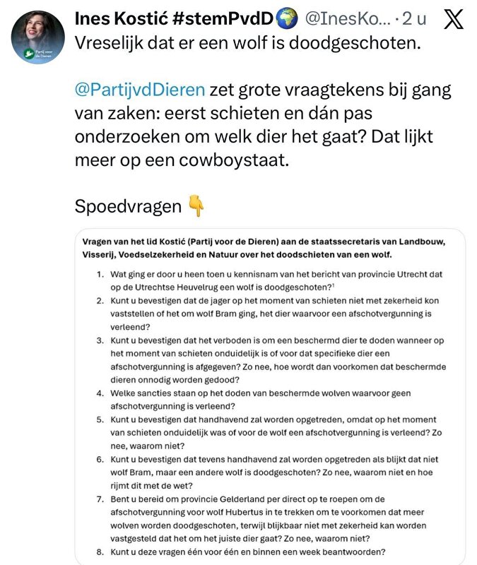 DubbelFun schreef:SusanH schreef:Zag op Facebook een melding van de PvdD, die willen onderzoek of afschot wel nodig was en waarom niet eerst voor andere maatregelen is gekozen. Zijn zeker vergeten dat hun eigen actiegroepen daartegen geprocedeerd hebben.