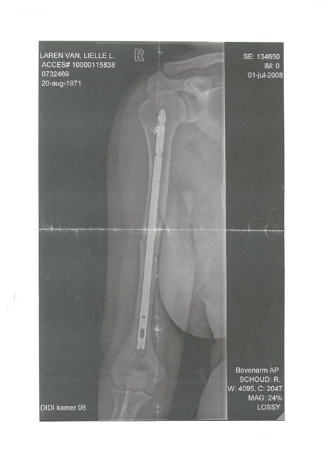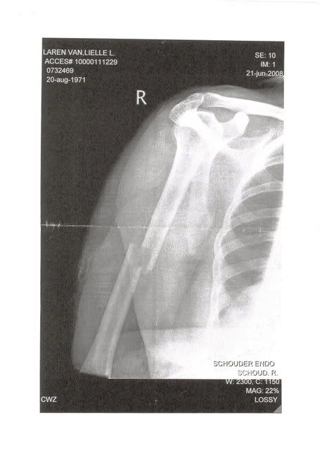 Mijn schouder is gebroken, net onder de schouderkop, volgens hem werd dit een vreselijk zwaar en pijnlijk proces.