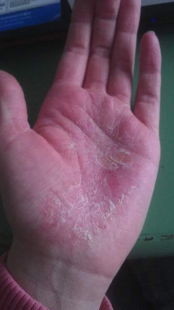 Dit lijkt heel erg erop wat ik op mijn handen heb. Gevoelig, droog en heel erg schilferig. Ik heb eczeem, denk dat jij dat ook hebt?